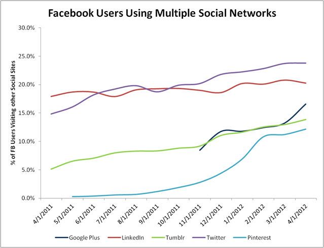 Di recente comScore ha diffuso i risultati di una ricerca, dai quali si evince che il 40% degli utenti Facebook utilizza, contestualmente, un altro social network. Questa percentuale è raddoppiata rispetto allo scorso anno.