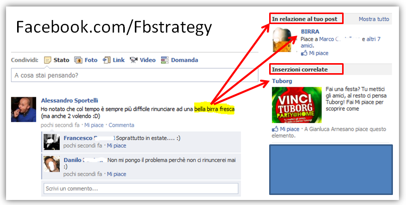 Sembra infatti che Facebook stia relazionando la tipologia di annunci alle parole che appasiono nello stato degli utenti. Guardate questa immagine, tratta da FacebookStrategy, per farvi un’idea di cosa stiamo parlando: