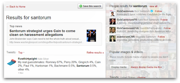 Questi primi test hanno inoltre evidenziato come Twitter voglia dare una rilevanza massima alle “Top News & People”, visto che per visualizzare tutti i risultati a seguire, quelli più “comuni“, è necessario selezionare l’apposita voce con il mouse. E’ chiaro che quanti verranno definiti come “top” da Twitter avranno un vantaggio notevole in termini di visibilità rispetto a tutti gli altri utenti coinvolti in quella stessa ricerca.